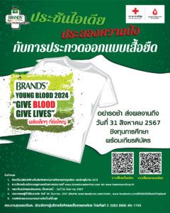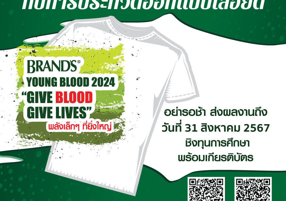 บริษัท ซันโทรี่ เบเวอเรจ แอนด์ ฟู้ด (ประเทศไทย) จำกัด ผู้นำตลาดอาหารเสริมสุขภาพภายใต้ตราผลิตภัณฑ์แบรนด์ในประเทศไทยและภูมิภาคเอเชีย จับมือ ศูนย์บริการโลหิตแห่งชาติ สภากาชาดไทย ขยายเวลาแคมเปญประกวดออกแบบลายเสื้อยืดในคอนเซปท์ “Give Blood Gives Lives…พลังเล็ก ๆ ที่ยิ่งใหญ่” ภายใต้โครงการ “แบรนด์…พลังเพื่อเลือดใหม่ ต่อพลังชีวิต 2567” (BRAND’S Young Blood 2024) ที่ดำเนินการต่อเนื่องเป็น ปีที่ 24 เชิญชวนนิสิตนักศึกษาทั่วประเทศ เข้าร่วมแคมเปญเพื่อ ชิงทุนการศึกษา เกียรติบัตรและผลิตภัณฑ์แบรนด์ตลอดปี โดยลายเสื้อที่ชนะการประกวดจะถูกนำไปผลิตเป็นเสื้อยืดเพื่อมอบให้กับผู้บริจาคโลหิตให้กับสภากาชาดไทย สามารถส่งผลงานร่วมโครงการตั้งแต่วันนี้ – วันที่ 31 สิงหาคม 2567
