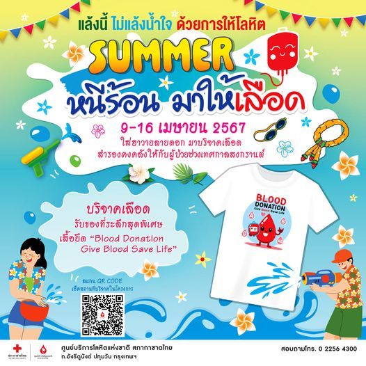 ศูนย์บริการโลหิตแห่งชาติ ชวนใส่เสื้อฮาวายลายดอก บริจาคโลหิตในโครงการ “แล้งนี้ไม่แล้งน้ำใจ ด้วยการให้โลหิต” เตรียมพร้อมสำรองโลหิตรับมือหยุดยาวช่วงเทศกาลสงกรานต์ ระหว่างวันที่ 9 -16 เมษายน 2567 ณ ศูนย์บริการโลหิตแห่งชาติ หน่วยรับบริจาคโลหิตประจำที่ (Fixed Station) และภาคบริการโลหิตแห่งชาติ ทั่วประเทศ พร้อมรับเสื้อยืดสุดเท่ “BLOOD DONATION Give Blood Save Life” แทนคำขอบคุณ